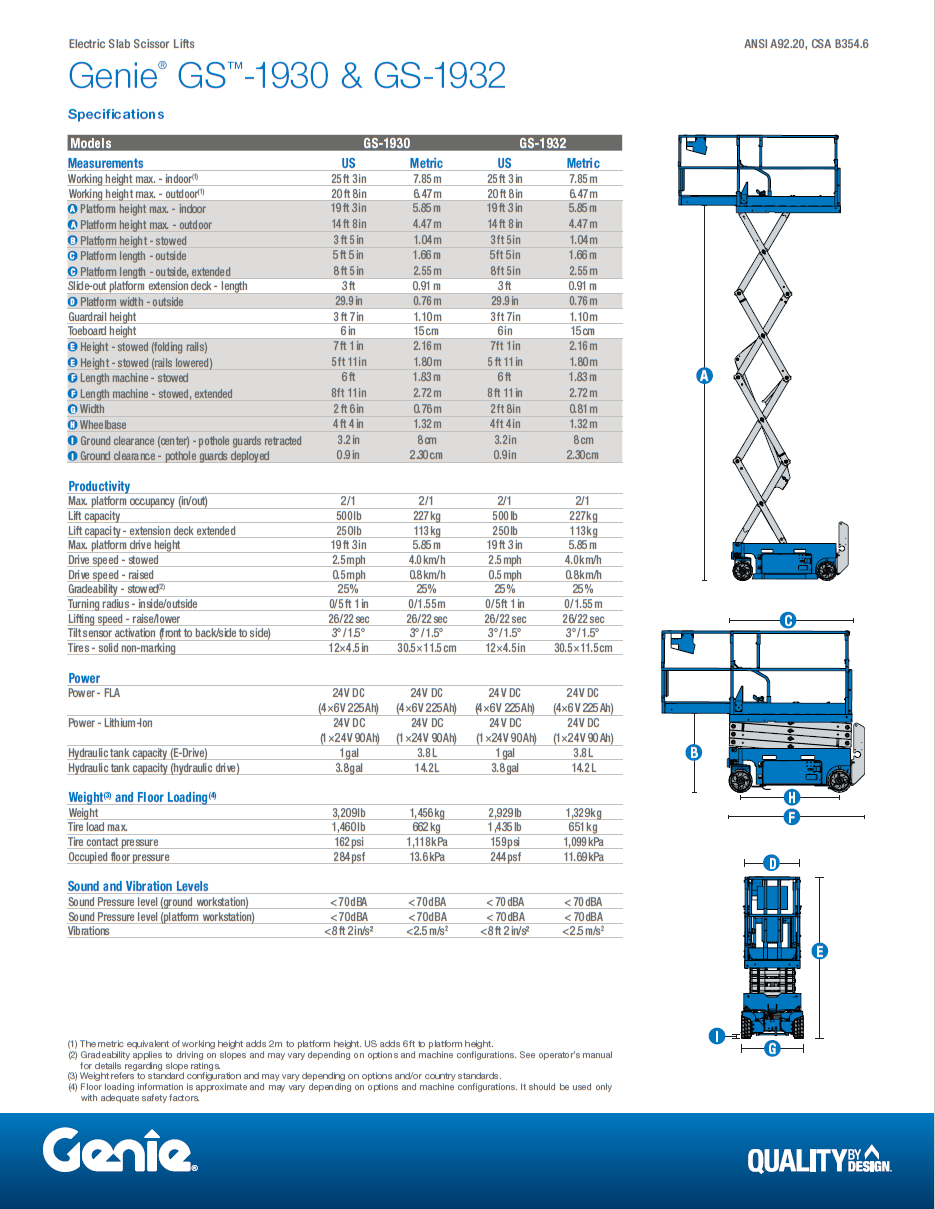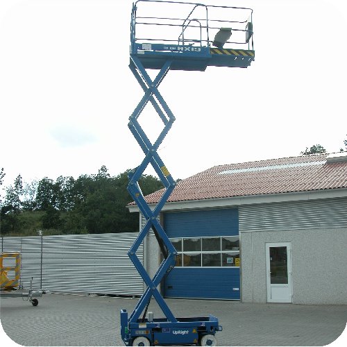 Genie 1930-1932 Arbejdshøjde 7,85 meter. Måler 85x180/272 cm. Løfter 227 kg.