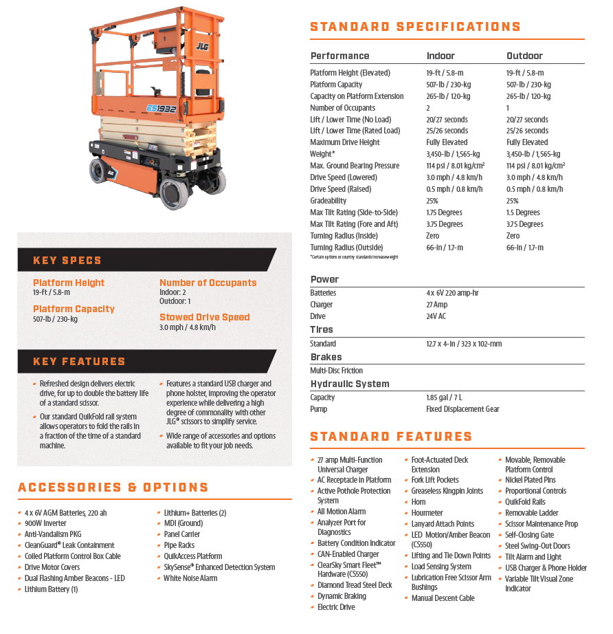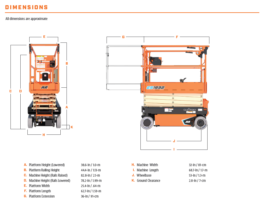 | JLG ES1932 | En dags leje | 2 dage | 3 dage | 4 dage | 5 dage | Her efter pr. dag | Levering* | Afhentning |