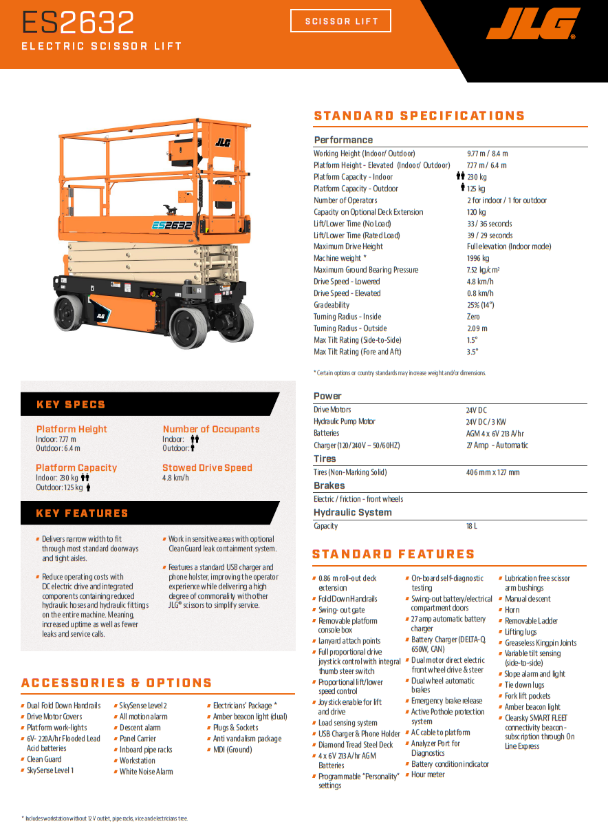 | JLG ES2632 | En dags leje | 2 dage | 3 dage | 4 dage | 5 dage | Her efter pr. dag | Levering* | Afhentning |