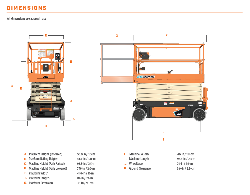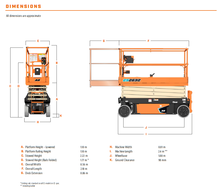 Arbejdshøjde 9,8 meter. Måler 82x240/326 cm. Løfter 230 kg.