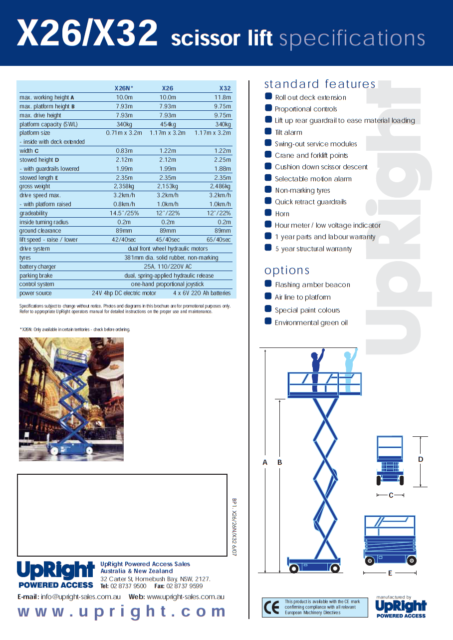 Arbejdshøjde 7,85 meter. Måler 85x180/272 cm. Løfter 227 kg.
