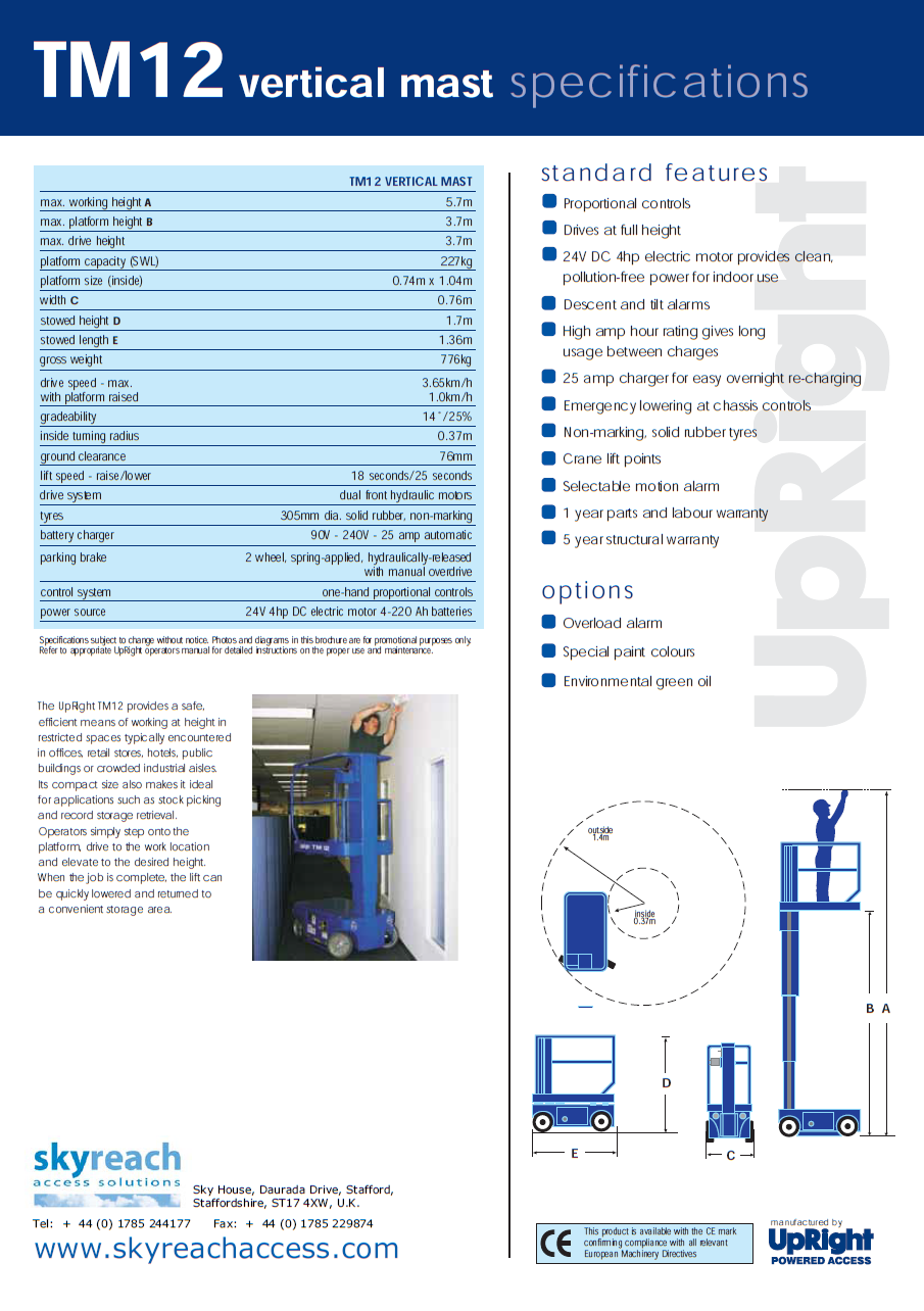 Arbejdshøjde 5,7 meter. Måler 76x136 cm. Løfter 227 kg.