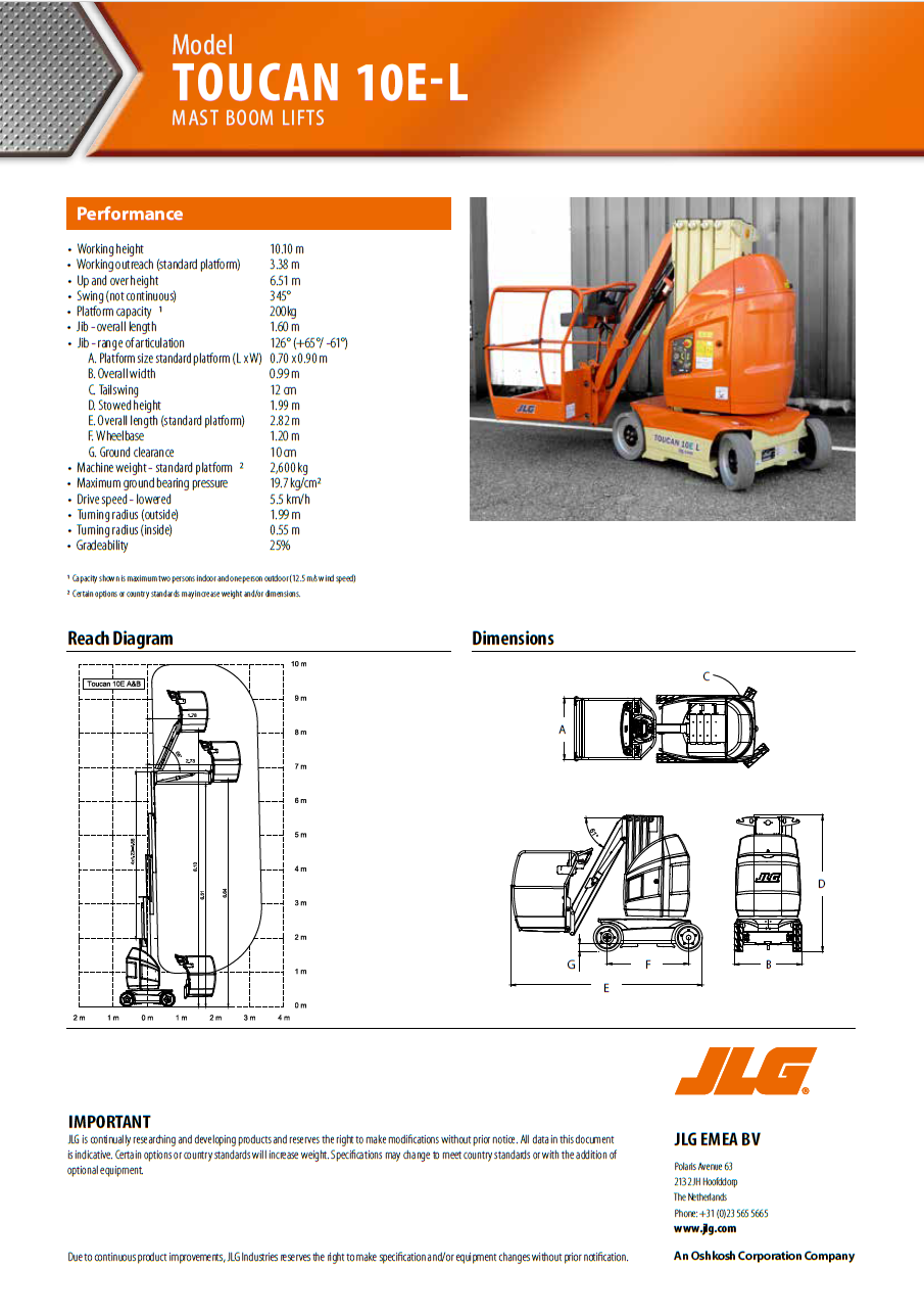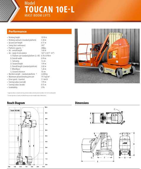 Arbejdshøjde 10,1 m. Udlæg 3,38 m. B. 99 H. 199 L. 282 cm. Løfter 200 kg.