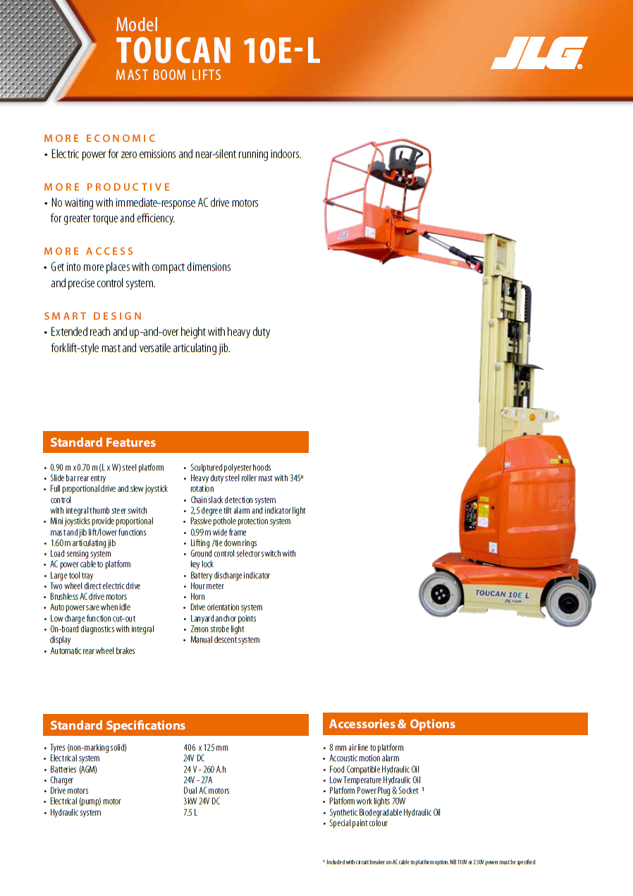 | JLG Toucan 10E-L | En dags leje | 2 dage | 3 dage | 4 dage | 5 dage | Her efter pr. dag | Levering* | Afhentning |