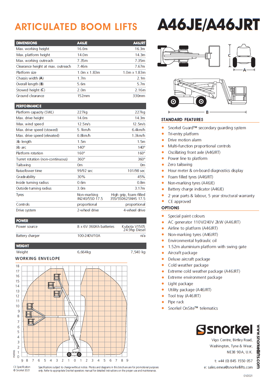 | Snorkel A46JE | En dags leje | 2 dage | 3 dage | 4 dage | 5 dage | Her efter pr. dag | Levering* | Afhentning |