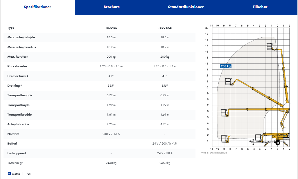 Liften har en max arbejdshøjde på 18,3 meter.