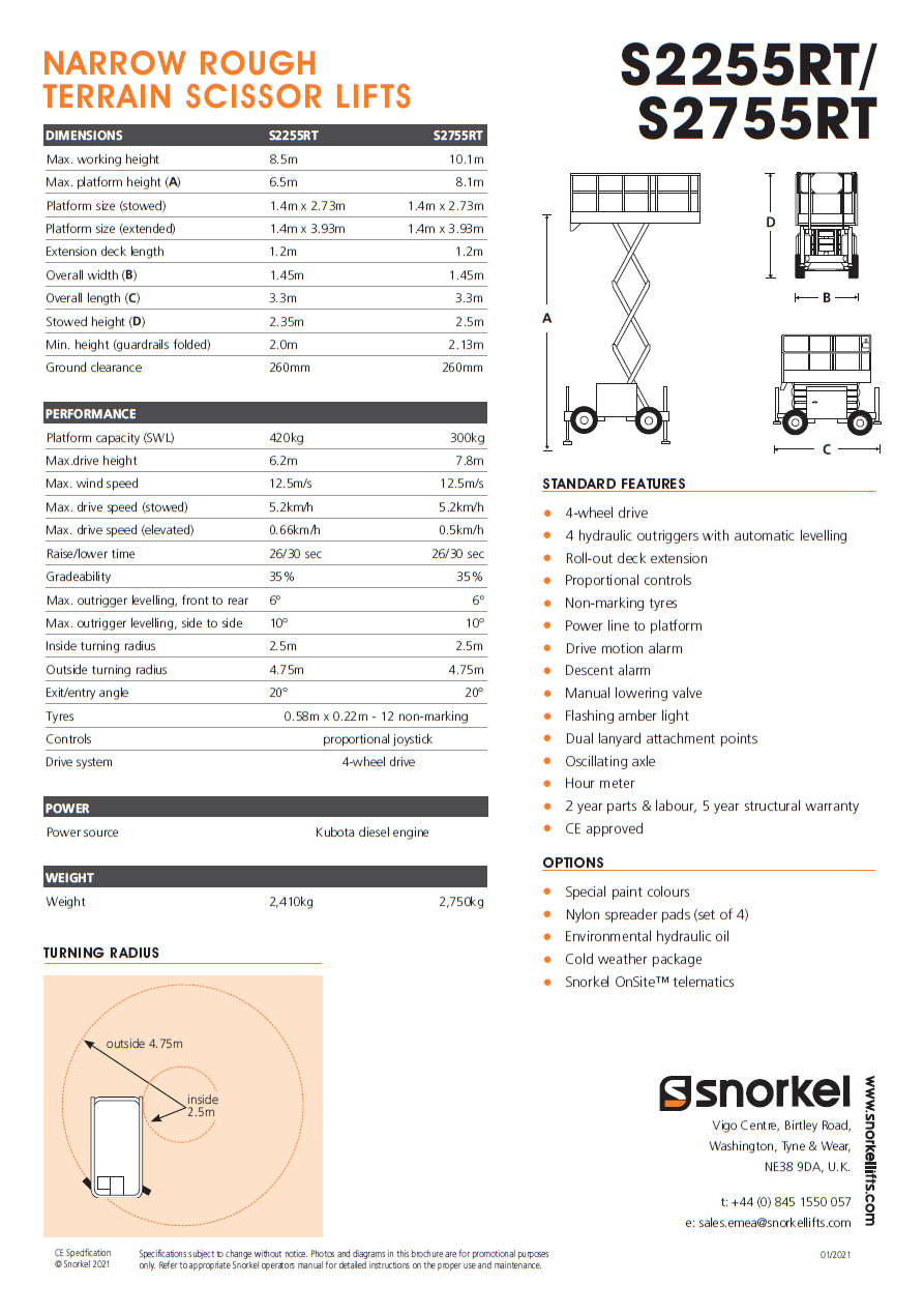 | Snorkel S2255RT | En dags leje | 2 dage | 3 dage | 4 dage | 5 dage | Her efter pr. dag | Levering* | Afhentning |